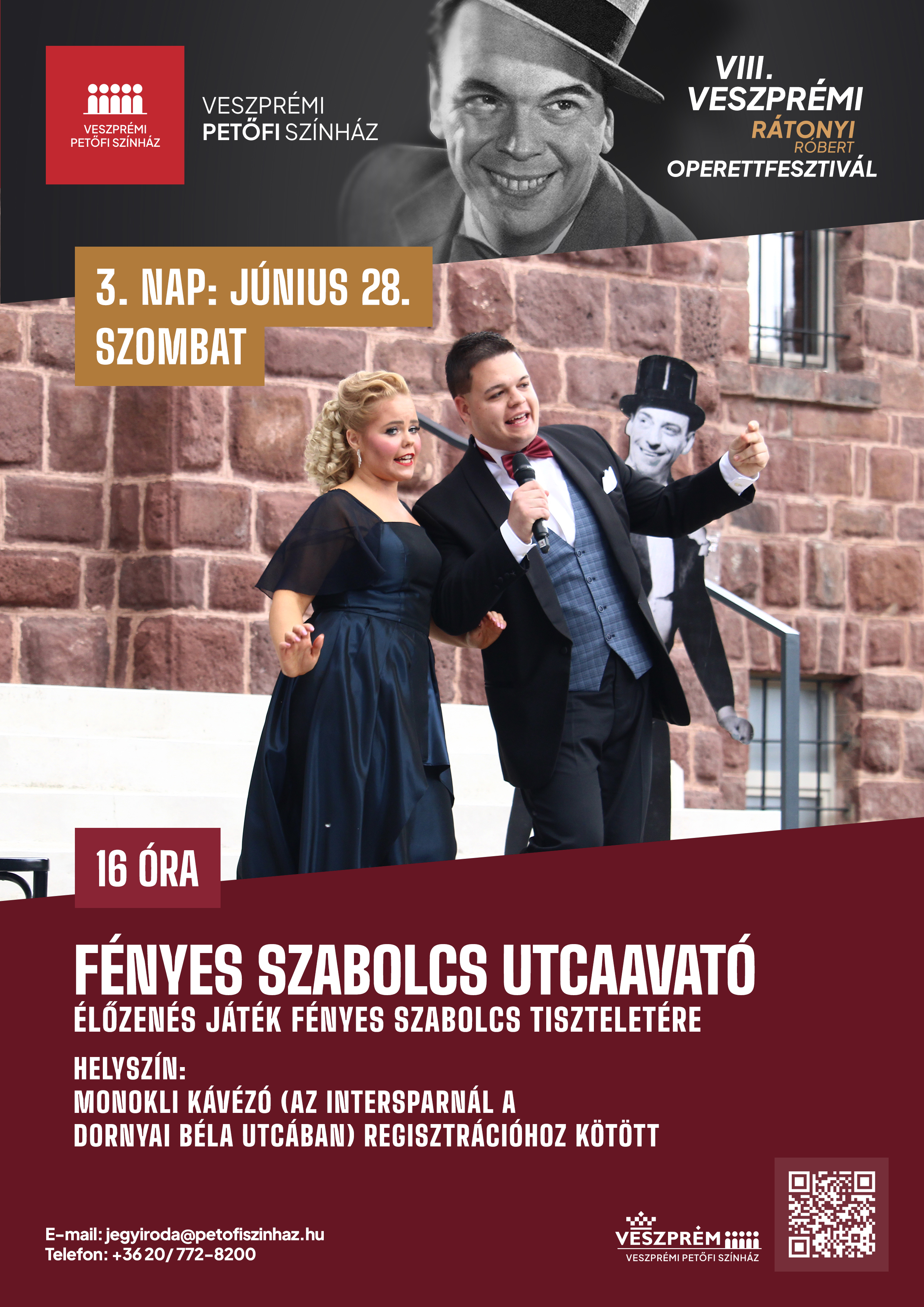 Elmaradhatatlan programelem az utcaavató is. Ezúttal a Dornyai Béla utcát nevezzük át a fesztivál idejére Fényes Szabolcs utcává, megemlékezve az Erkel Ferenc-díjas zeneszerzőről, akinek a nevéhez számos örökzöld sláger és filmzene kötődik. Az eseményre a Monokli Brunch kávézóban kerül sor 16 órai kezdettel. Közreműködnek a Veszprémi Petőfi Színház művészei, Rubold Emília, Hirschl Laura, Szederjesi Teodóra, Flór Máté Gellért, Keller Márton, Horváth Dániel és Rubóczki Márkó, valamint Horváth Elemér Emi és Horváth Péter. (A programon való részvétel regisztrációhoz kötött.)