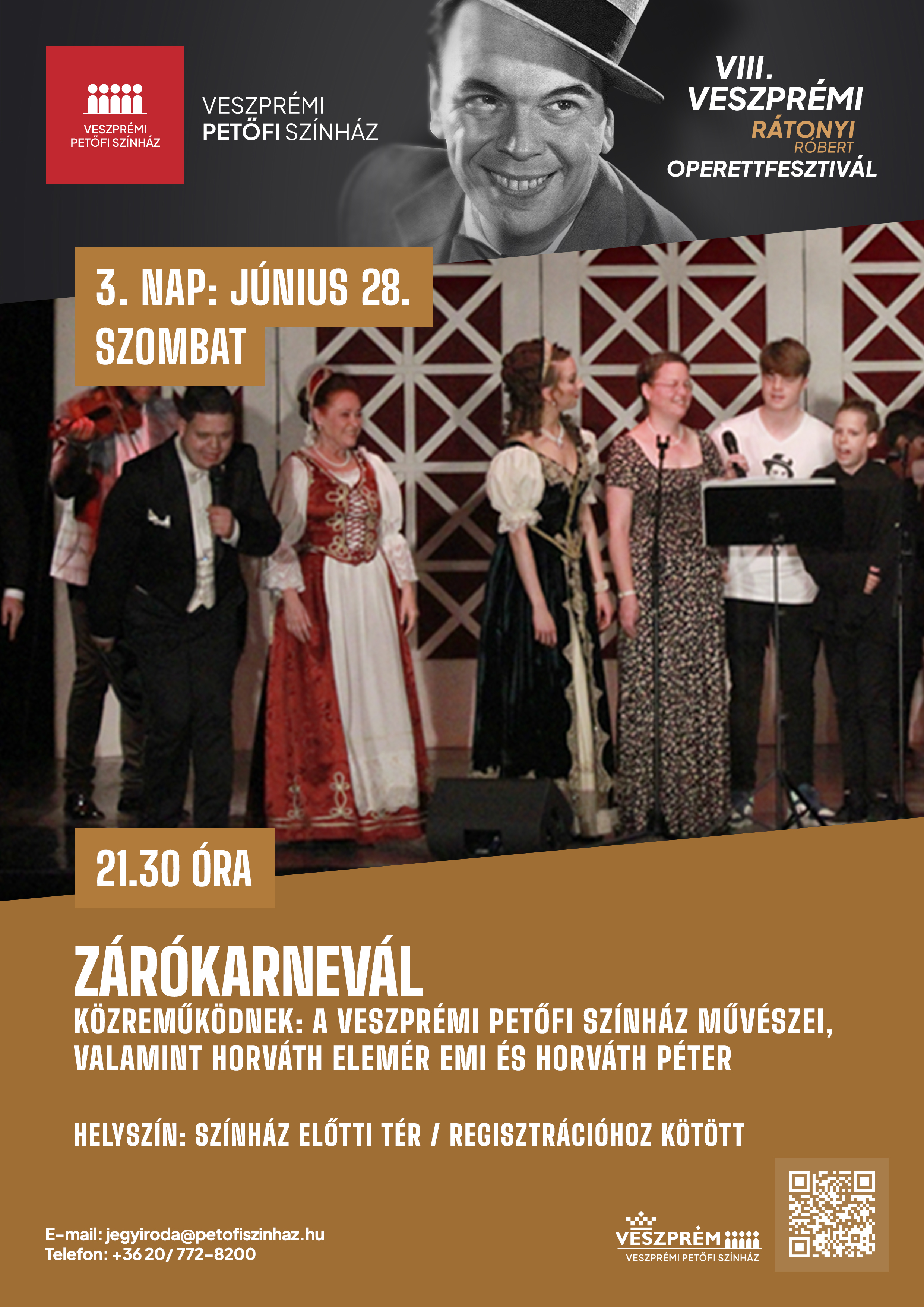 De ezzel még nincs vége: az előadás után kezdődik a Veszprémi Petőfi Színház művészei, valamint Horváth Elemér Emi és Horváth Péter részvételével a Zárókarnevál. Ezzel a – regisztráció ellenében látogatható –, nagy közös énekléssel színesített programmal kerül fel a korona a három plusz egy fantasztikusnak ígérkező napra. Vidám hangulatban, hiszen jövőre is lesz Veszprémi Rátonyi Róbert Operettfesztivál. A kilencedik. A közbenső időben talán senki sem bánja majd, hogy olyan gyorsan telik az idő...