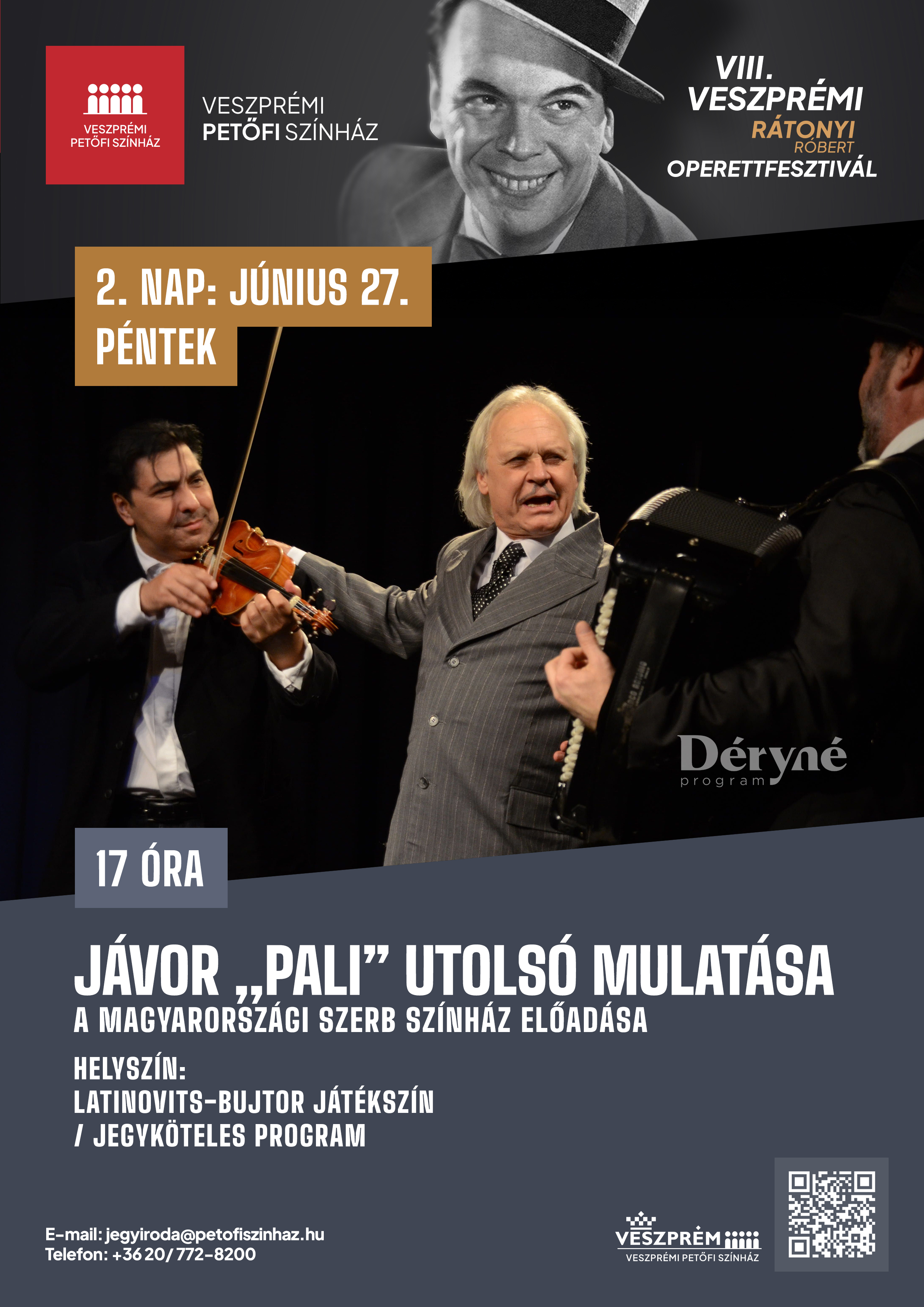 Jávor Pál a két világháború közti Magyarország színész-szupersztárja volt, aki pusztán a nevével megtöltötte a színházak és a mozik nézőterét. A nők epekedtek érte, a férfiak pedig ugyanolyan bajuszt növesztettek, mint neki volt. Imádott és tudott is mulatni, a társasági élet központi figurájának számított. A felszín tehát ragyogóbb már nem is lehetett volna. Aztán az is homályossá vált a háború végén és után. Másokhoz hasonlóan ő is Amerikában próbált szerencsét, mérsékelt sikerrel. 1957-ben az államhatalom hazacsábította. A felkínált, kecsegtető lehetőségekkel azonban nem tudott élni, mivel érkezéskor már súlyos beteg volt. 1959-ben bekerült a kórházba. Érezve a közelgő véget, cigányzenészeket rendelt, hogy életében még egyszer mulathasson... E megrendítő történetet dolgozta fel Jávor „Pali” utolsó mulatása című színdarabjában Rusz Márk Milán, a Magyarországi Szerb Színház vezetője. Az idős, kalandregényekbe kívánkozó sorsáról mesélő egykori csillagot Benkő Péter színművész alakítja. A 17 órakor kezdődő, a Latinovits-Bujtor Játékszínben tartandó előadás a Déryné-program támogatásával valósul meg. (Jegyköteles program.)