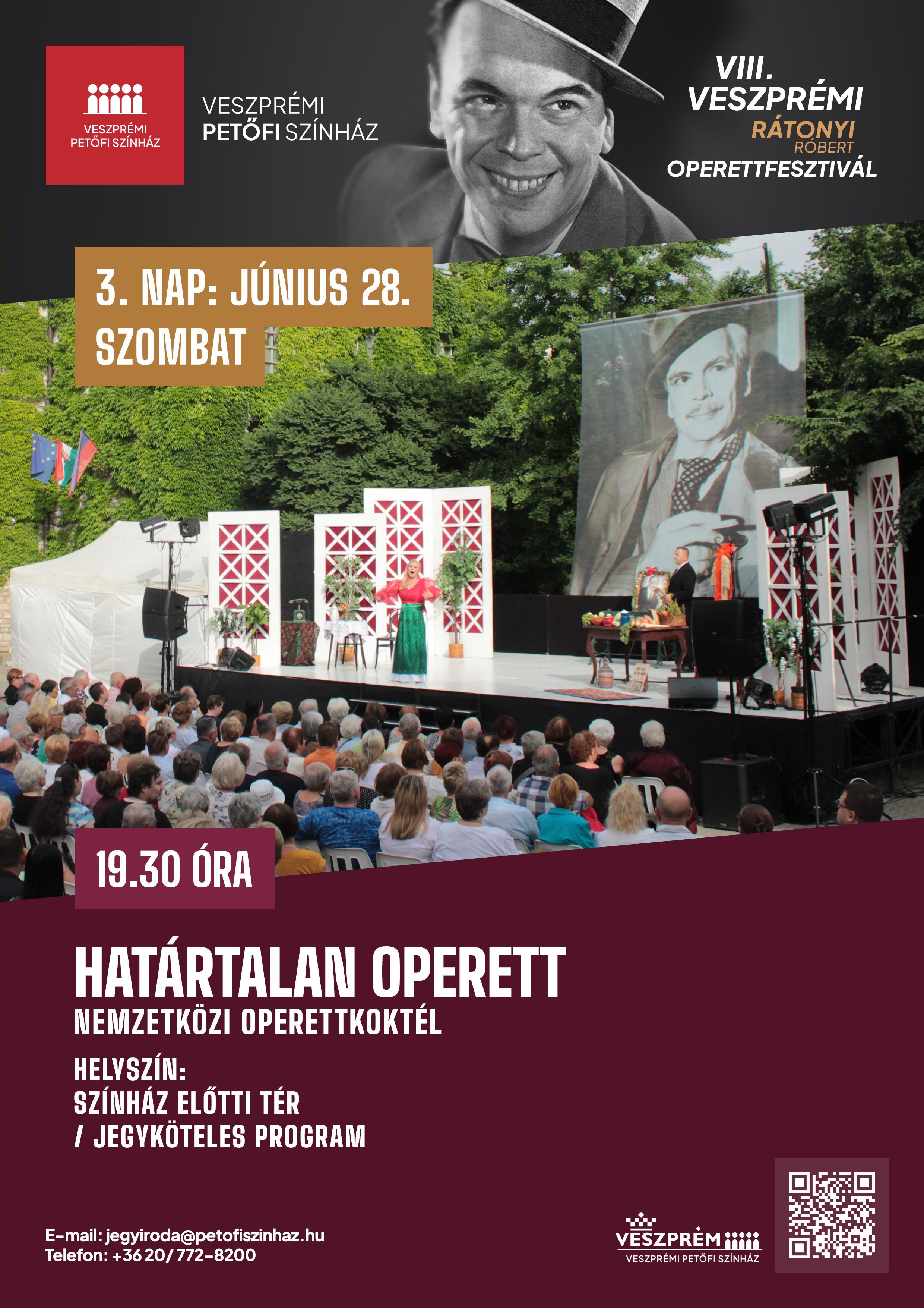 A tavalyi Veszprémi Rátonyi Róbert Operettfesztiválon sokan nem fértek be a Nemzetközi operettgálára. Mivel valószínűleg idén is nagy lesz érdeklődés, bekerült a programba a Határtalan operett című műsor, amelyen a Veszprémi Petőfi Színház határon túlról származó művészei, a vajdasági Módri Györgyi, a partiumi Kőrösi Csaba, a csíki Szederjesi Teodóra és Keresztes Gábor, valamint a gyergyószentmiklósi György-Rózsa Sándor – aki a Budapesti Operettszínház társulatának tagja – mellett a lett Jolanta Strikaite, Sonora Vaice és Karlis Rütentals, valamint az Ausztriából érkező Marta Stetsko és Ardeshir Babak is fellépnek. Az izgalmas összeállításhoz az élő zenei kíséretet Horváth Elemér Emi és Horváth Péter szolgáltatja. A Nemzetközi operettgálához hasonlóan Keller János rendezte Határtalan operett 19 óra 30 perckor kezdődik a színház előtti téren. (Jegyköteles program.)