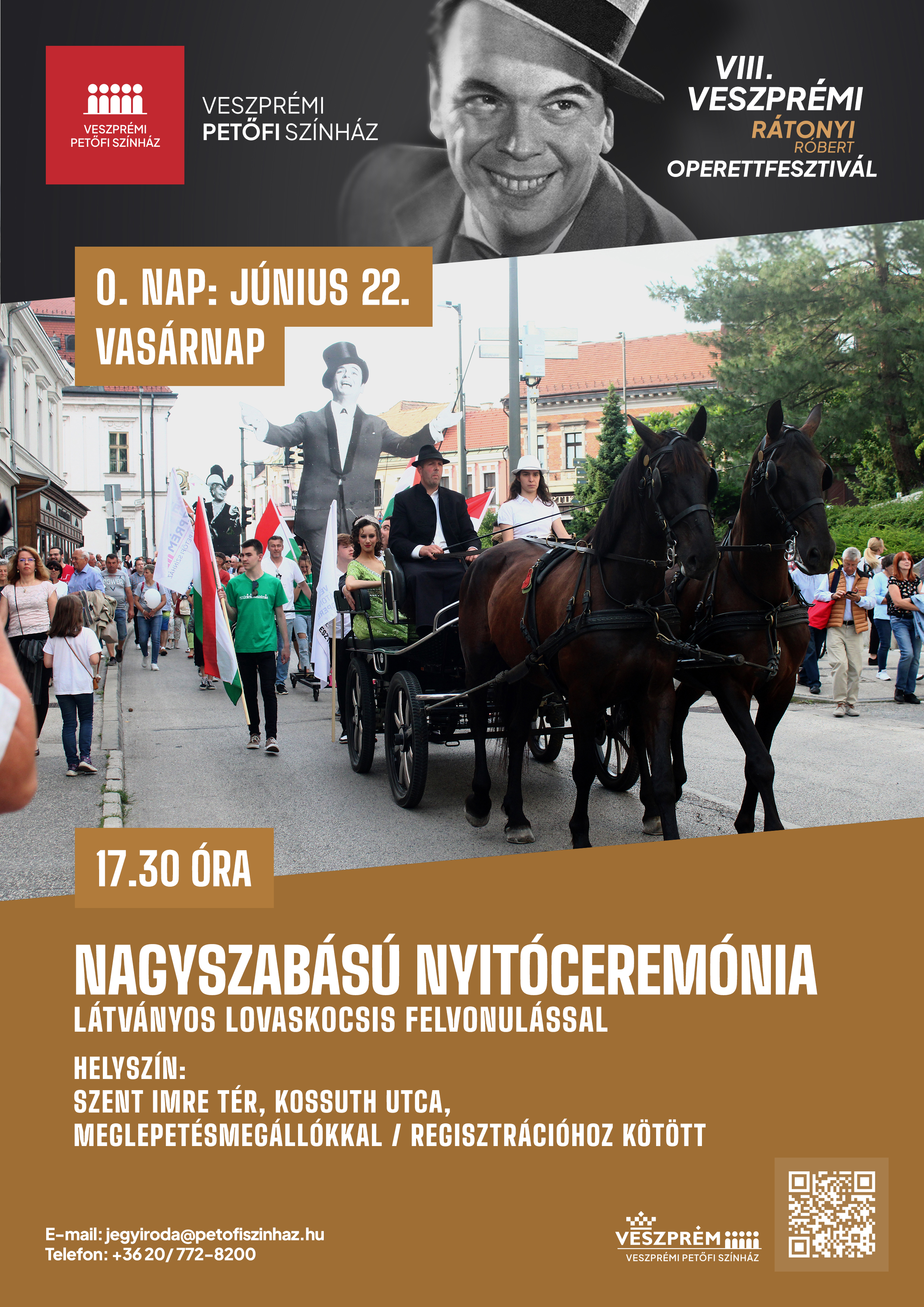 Ami viszont a veszprémi fesztiváleseményeket illeti, már minden végleges. Idén – rendhagyó módon – a fesztivál nulladik napja a főprogramot megelőző hét vasárnapján, június 22-én lesz. Ekkor kerül sor a fesztiválnak méltó felvezetést adó hagyományos, nagyszabású nyitóceremóniára, amely 17 óra 30 perckor kezdődik a megszokott helyszínen, a Szent Imre téren. Itt a Veszprémi Petőfi Színház népszerű művészei – Módri Györgyi, Palásthy Bea, Szederjesi Teodóra, Hirschl Laura, Keresztes Gábor, Lukács Dániel, Horváth Dániel, Cservenák Vilmos és Keller Márton adnak műsort élőzenei kíséret mellett, amelyet a színházbarátok által jól ismert Horváth Elemér Emi és Horváth Péter szolgáltat. A közönséget emellett cirkuszi produkciók és cheerleader-bemutató szórakoztatják. Ezután indul a hintós felvonulás a Kossuth utcán. A menet először a Kapuváry-ház erkélye alatt áll meg, ahol a Veszprémi Petőfi Színház társulatának tagjai, Rubold Emília és Rubóczki Márkó énekszóval üdvözlik a sétán résztvevő operettrajongókat. A következő megálló a Megyeháza erkélyénél lesz, amelyen Szeles József színművész jelenik meg. A zenéről mindkét helyszínen Balatonfüred Város Koncert Fúvószenekara gondoskodik. A felvonulás a Színházkertben ér véget. (A programon való részvétel regisztrációhoz kötött.)