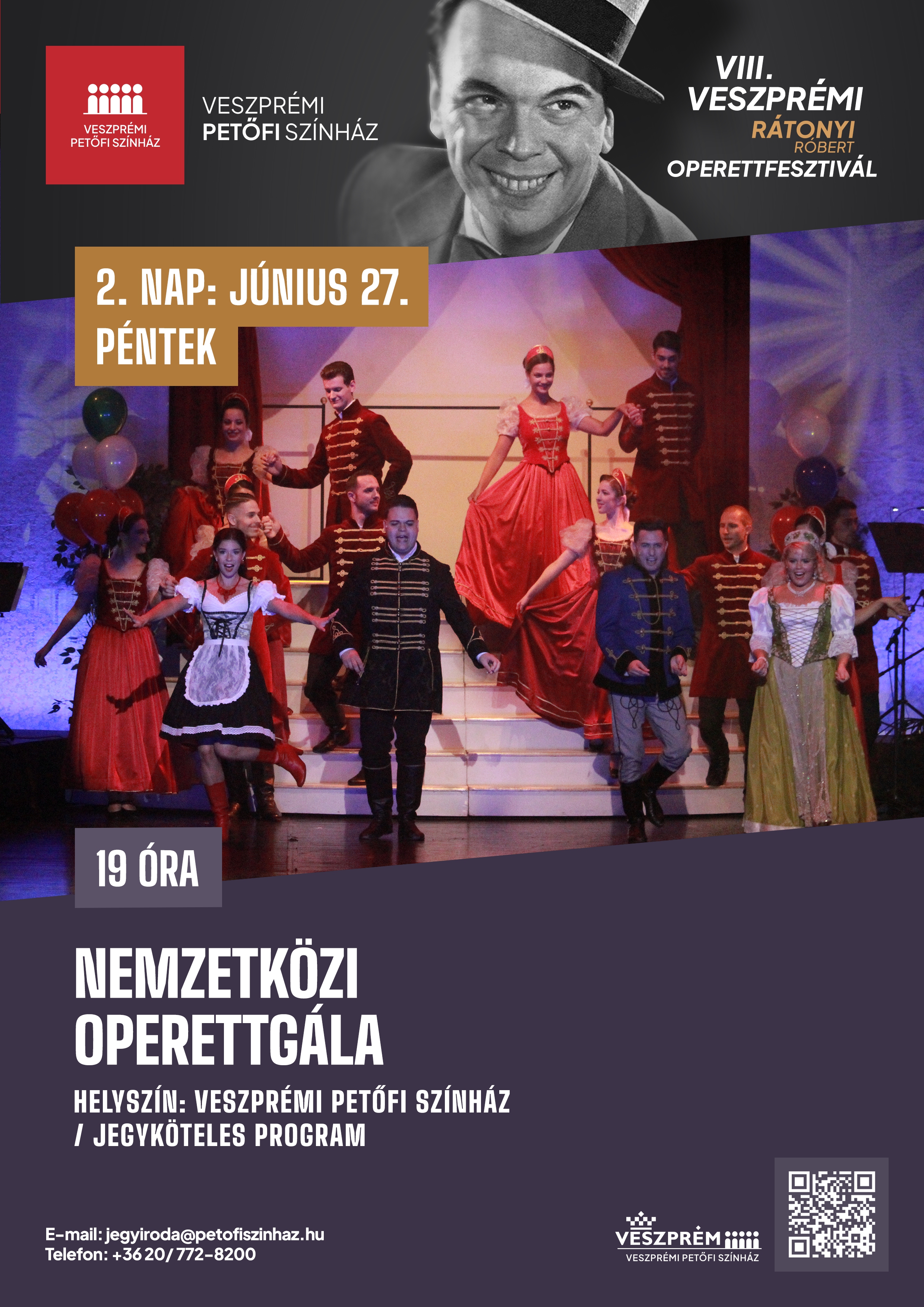 A VIII. Veszprémi Rátonyi Róbert Operettfesztivál egyik fénypontja lesz a június 27-ei, pénteki, 19 óra 30 perckor kezdődő Nemzetközi Operettgála, amelyen a Veszprémi Petőfi Színház társulatának tagjai, Módri Györgyi, Szederjesi Teodóra, Hirschl Laura, Szeles József, Kőrösi Csaba, Horváth Dániel, Keller Márton és Keresztes Gábor mellett Dolhai Attila és három lett – Jolanta Strikaite, Sonora Vaice, Karlis Rütentals és Patrīcija Kozlovska –, illetve két, az ausztriai Linzből érkezett szólista, Marta Stetsko és Ardeshir Babak lép fel. A külföldiek a saját anyanyelvükön éneklik majd a magyar operettslágereket, amelyek így – bár a dallam azonos – egészen más tartalommal és új színekkel telnek meg. A Keller János rendezte nemzetközi gálán a Sturcz Szmollbend zenekar adja az élő zenei kíséretet. Az est fényét a Király Béla vezette tánckar mellett a Szakálas Renáta és Rieberger Norbert által előadott cirkuszi produkció is emeli. Már ebből is látszik, hogy igen sokszínű élményt nyújt majd a Nemzetközi Operettgála – amely így, ebben a formában csak most lesz látható. (Jegyköteles program.)