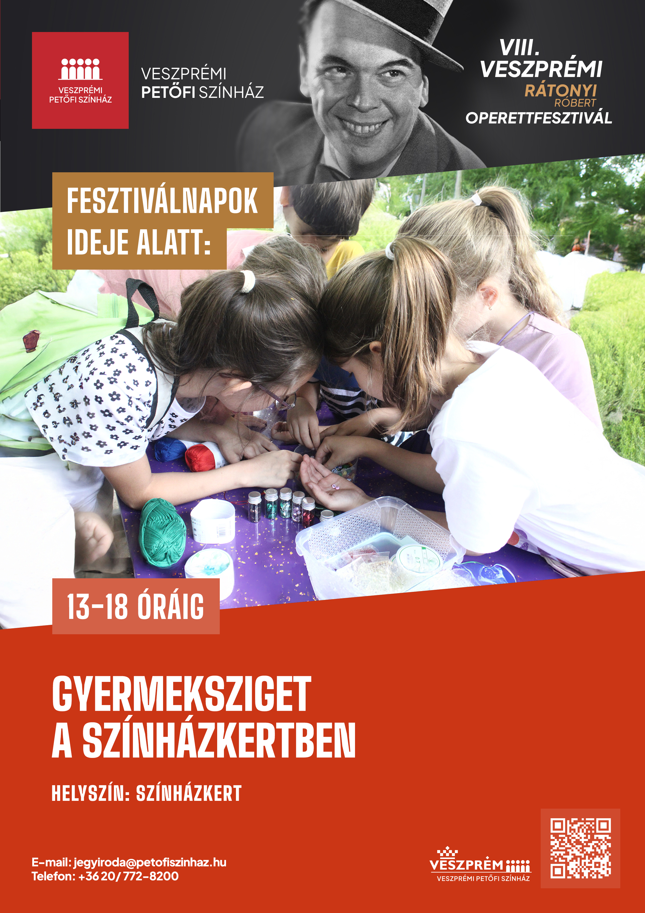 Az operettfesztivál kiemelten fontos helyszínének számító, hangulatos Színházkert ezen a napon népesül be újra. 13 órakor nyitja meg kapuit a minden évben sok családot vonzó Gyereksziget, ahol egyebek mellett kézművesfoglalkozásra várják a legifjabbakat. 15 órakor itt kerül sor a VIII. Veszprémi Rátonyi Róbert Operettfesztivál rajzpályázatának eredményhirdetésére. A Gyereksziget a fesztivál három napján 13 órától 18 óráig tart nyitva. E napon indulnak a VIII. Veszprémi Rátonyi Róbert Operettfesztivál további kísérőprogramjai, az egyebek mellett pónilovaglási lehetőséget és különleges attrakciókat felvonultató Varázslatos Vidámpark, valamint a finomságokat kínáló Gasztroperett is. Ezek 13 órakor kezdődnek és egészen az aznapi programok végéig várják a látogatókat.
