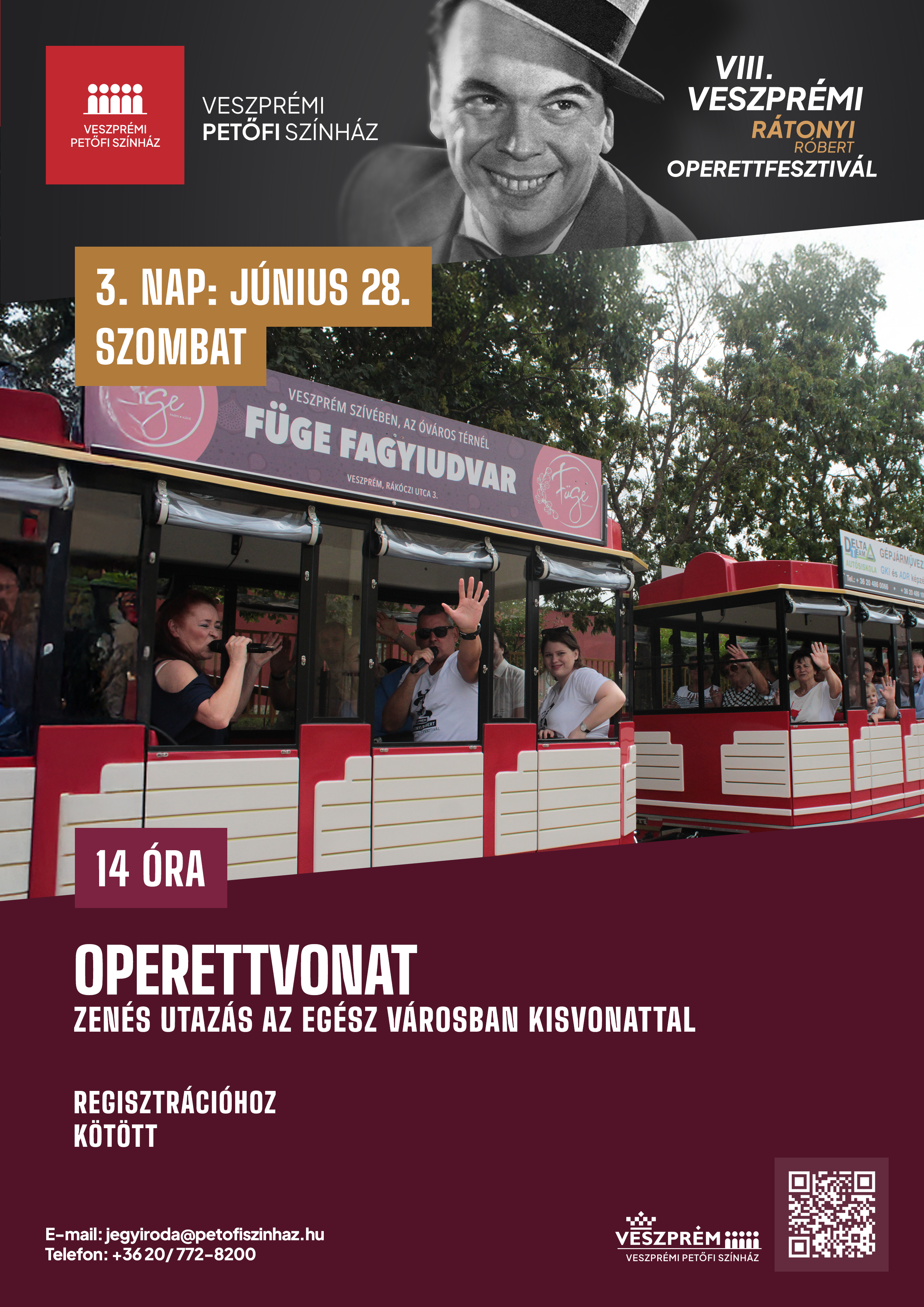 Idén sem maradhat el a Veszprémi Rátonyi Róbert Operettfesztivál egyik ikonikus, hihetetlen népszerűségnek örvendő programja, az Operettvonat. A várost bejáró szerelvény, amelyen népszerű operettszámok hangzanak el a Veszprémi Petőfi Színház művészeinek azaz Módri Györgyinek, Szederjesi Teodórának, Hirschl Laurának, Keresztes Gábornak, Horváth Dánielnek és Keller Mártonnak az előadásában, 14 órakorindul a Megyeház térről. (A programon való részvétel regisztrációhoz kötött.)