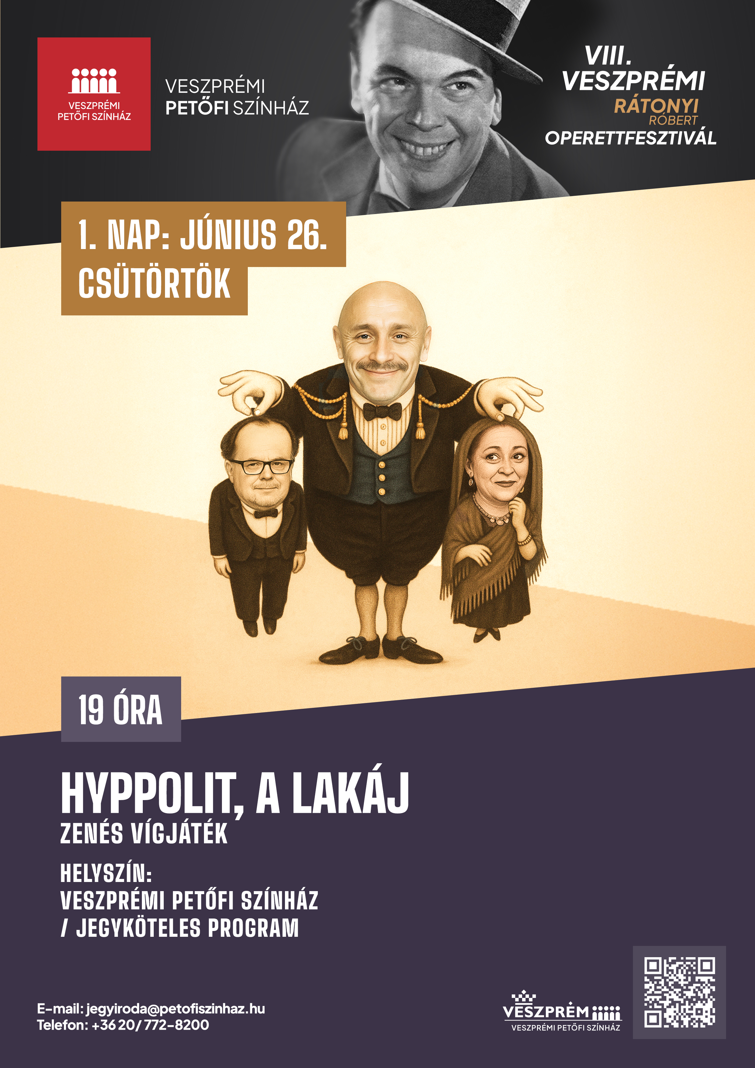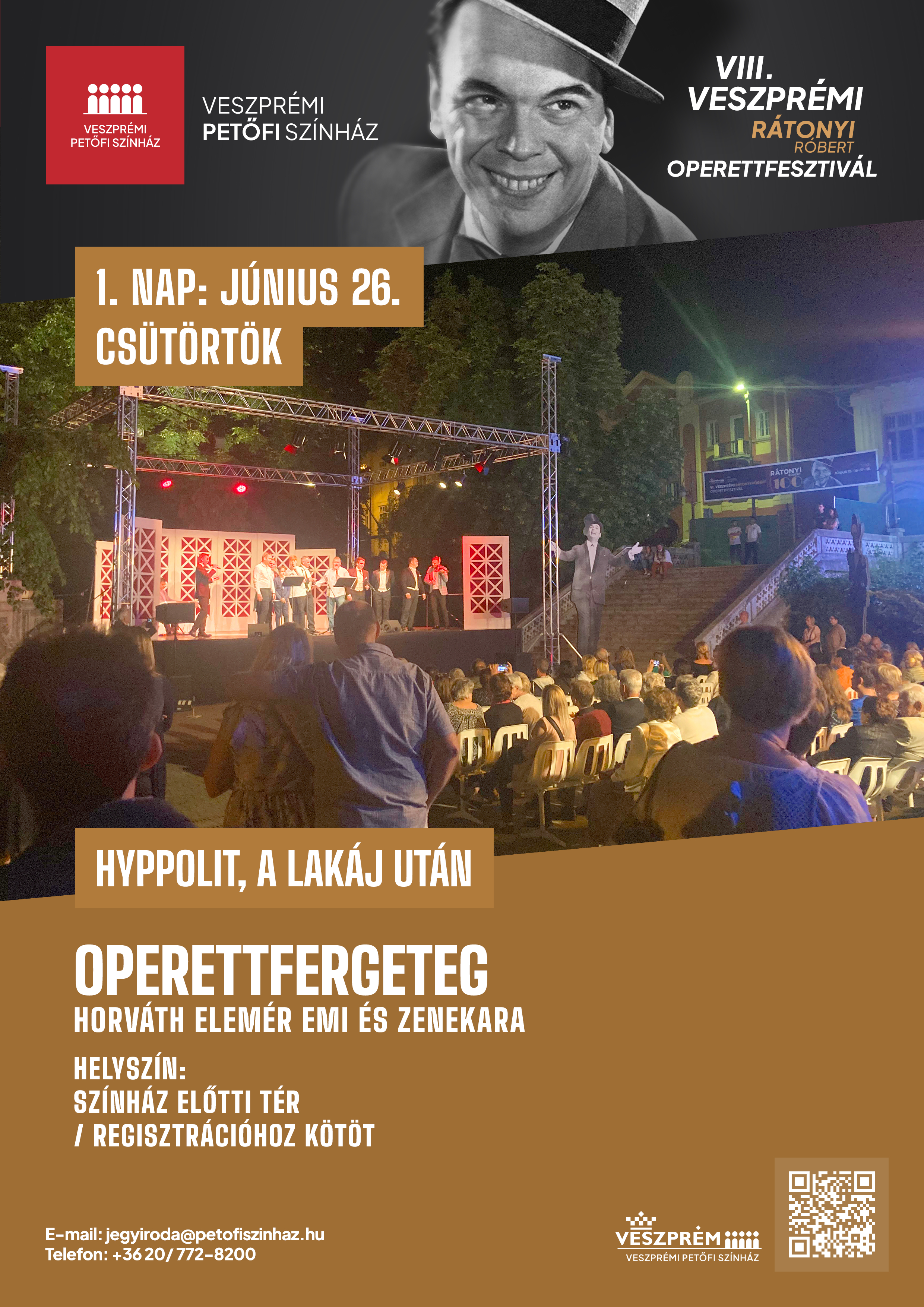 19 órakor kezdődik az előzetes nézői visszajelzések szerint nagyon várt, a VIII. Veszprémi Rátonyi Róbert Operettfesztivál egyik fénypontjának ígérkező Hyppolit, a lakáj című zenés vígjáték, amelynek rendezője Dolhai Attila. Parádés a szereposztás is: Hyppolitot Cservenák Vilmos, Schneider Mátyást Kőrösi Csaba, Schneiderné Arankát Módri Györgyi, a lányukat, Terkát Szederjesi Teodóra, Makács főtanácsost Szeles József, Nagy Andrást Horváth Dániel, Mimi lokáltáncosnőt Hirschl Laura, Makács Csabát Keller Márton, Tóbiást Rubóczki Márkó, Julcsát pedig Haraszti Elvira alakítja. Az előadás koreográfusa Király Béla, zenei vezetői pedig Horváth Elemér Emi és Horváth Péter. (Jegyköteles program.)