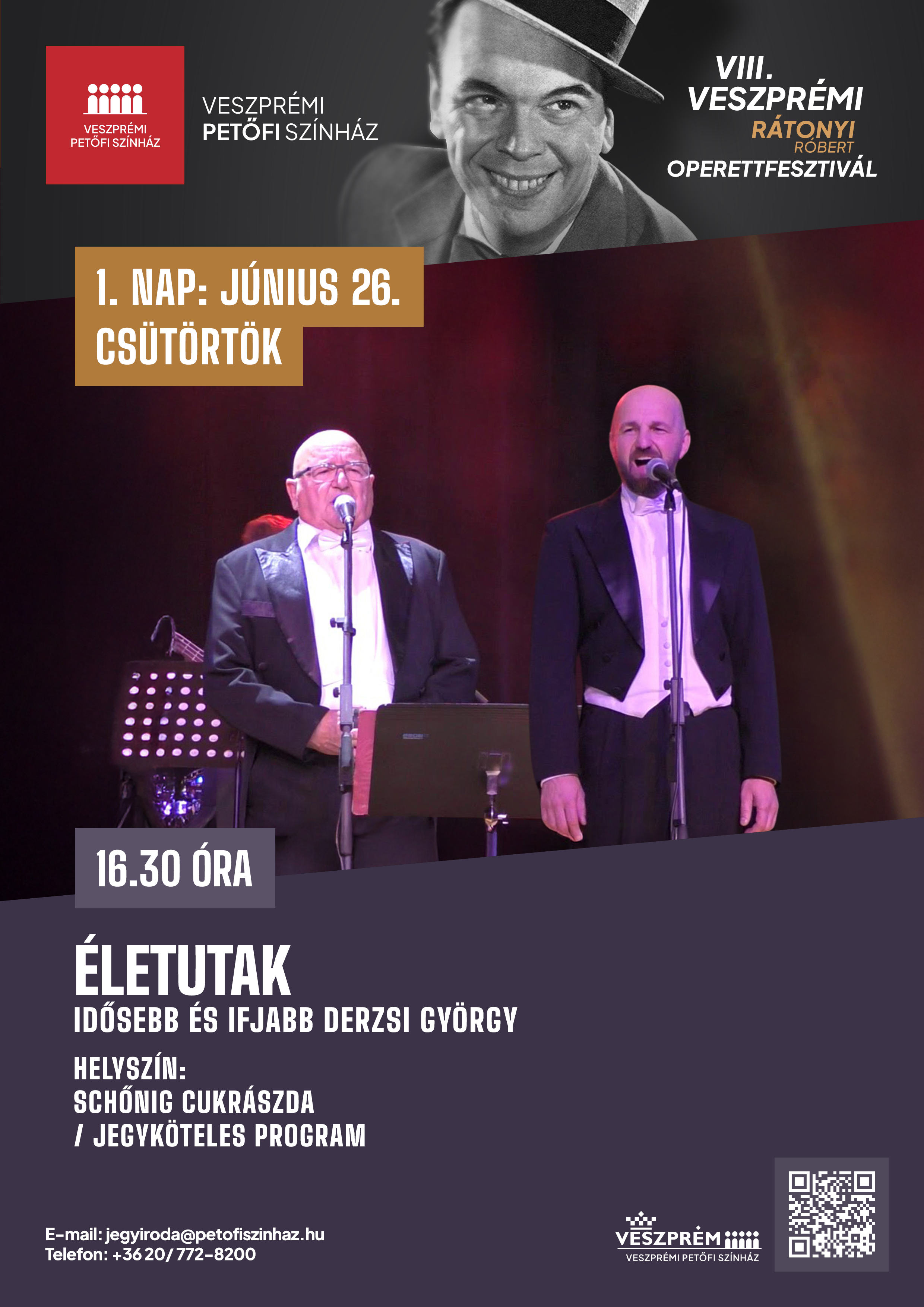A felnőtteknek szóló programokat az Életutak című beszélgetéssorozat első epizódja nyitja, amely 16 óra 30 perckor kezdődik a Schőnig Cukrászdában. Kellerné Egresi Zsuzsanna ezúttal a felvidéki és a magyarországi operettrajongók körében népszerű, a pályán immár több mint hatvan esztendőt eltöltött idősebb, illetve a musicalvilágban nagy ismertségnek örvendő ifjabb Derzsi Györgyöt kérdezi. A generációk találkozását és egymásra hatását – amit az operettfesztivál megálmodói különösen fontosnak tartanak – gyönyörűen példázó előadás akadálymentesített lesz, így azt hallás-, látás-, illetve mozgáskárosultak is megtekinthetik. (Jegyköteles program.)